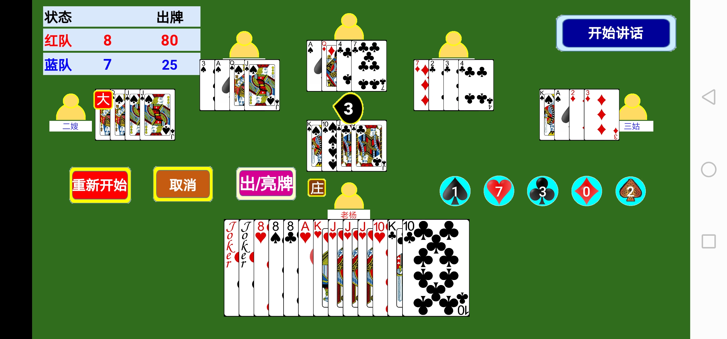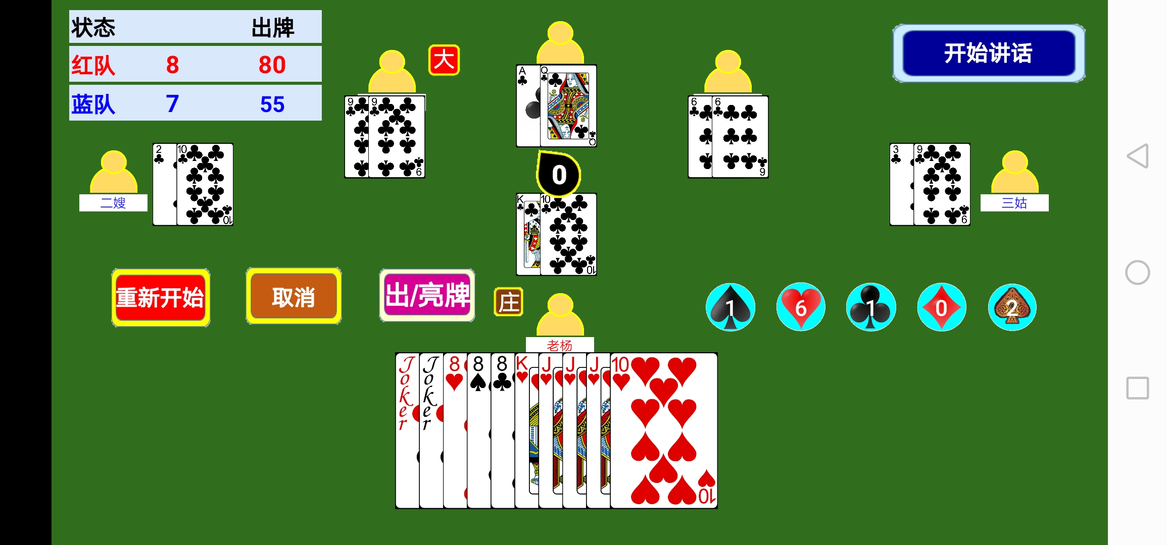 若是游戏创立家,在玩的过程中,发完牌后,可用"取消"撤回最后一玩家的牌(若用笨笨则不行)。用 "重新开始"开始新一句牌。